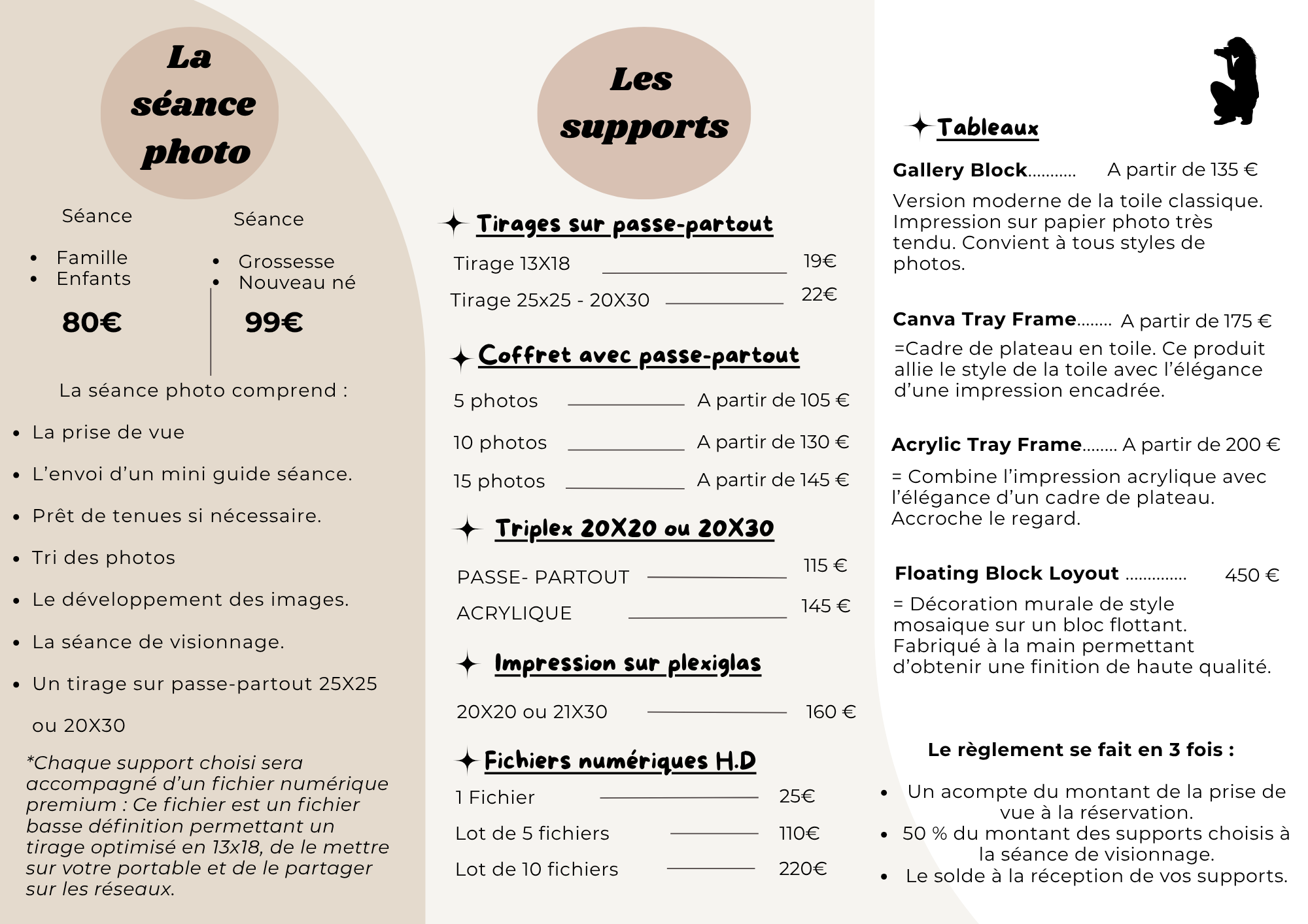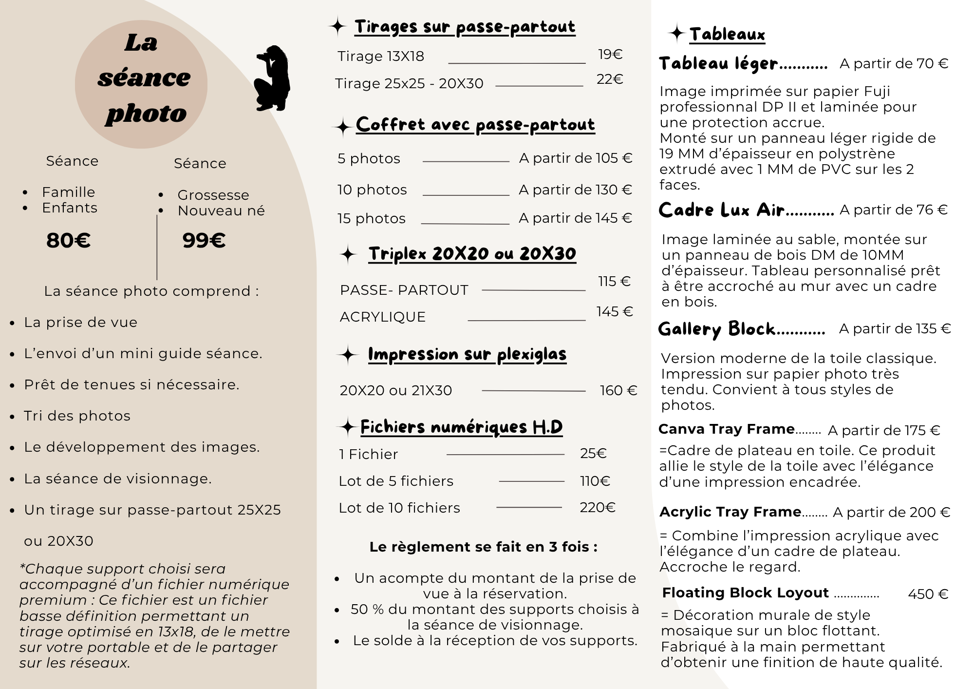La séance photo à 80 € ou 90 € comprend :